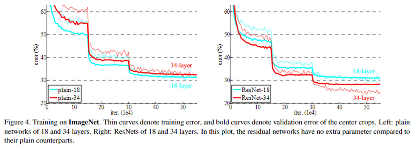 ResNet을 사용하는 경우 단순한 네트워크와 다르게 층이 깊어짐에따라 train과 test 셋에 대하여 error율이 모두 낮아지는 결과를 위의 그래프로 확인할 수 있습니다.