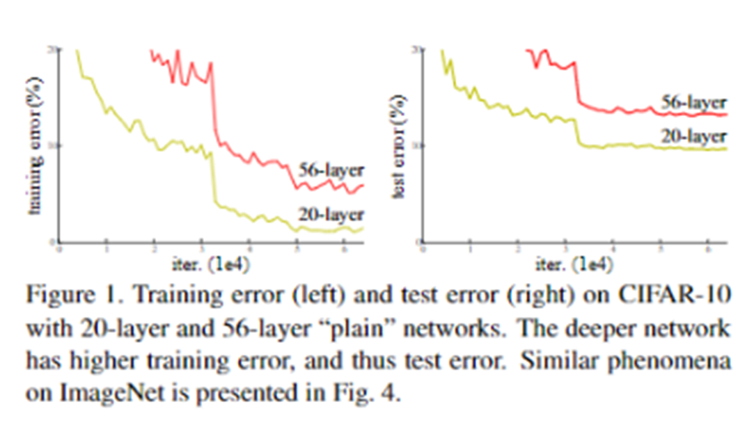 깊이가 깊으면 단순히 파라미터가 많아져 모델이 과대 적합된다고 생각할 수 있습니다. 하지만 저자는 모델의 성능을 최대로 만드는 layer이상을 쌓게될시 train, test set 모두에 대하여 성능이 낮아진다고 하였으며 이를 "degradation problem"이라 하였습니다.