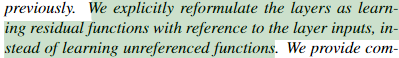 Abstract 부분에서 ResNet구조가 어떠한 의미로 고안되었는지 말해줍니다. 깊은 네트워크 학습이 어렵기에 이 문제를 해결하기 위하여 참조되지 않은 함수가 아니라 입력층을 학습하여 층을 만들어 “잔차 함수”(Residual function)라는 새로운 층을 만드는 통찰? 에서 시작되었다고 합니다.
