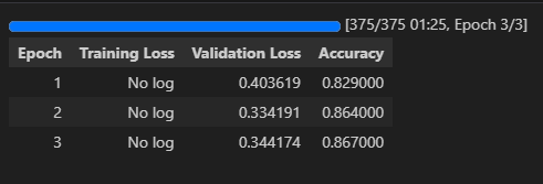 TrainOutput(global_step=375, training_loss=0.37965966796875, metrics={'train_runtime': 86.0023, 'train_samples_per_second': 34.883, 'train_steps_per_second': 4.36, 'total_flos': 789333166080000.0, 'train_loss': 0.37965966796875, 'epoch': 3.0})